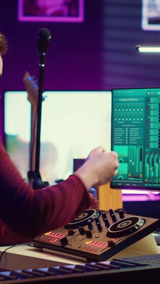 Vertical Video Music engineer using usb stick to edit and add sound effects on audio recording, adjusted volume levels. Artist doing mixing and mastering technique on soundboard, plays piano. Camera A. Pro Video