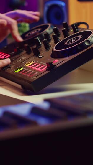 Vertical Video Experienced audio engineer uses mixing board to create new song in recording home studio. Post production equipment and tools on computer, operates digital audio workstation software. Camera A. Pro Video