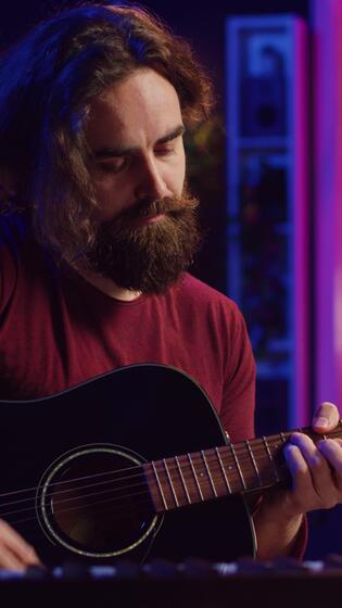 Vertical Video Artist playing guitar and uses DAW software interface to create music, looking at mastering controls on computer screen. Musician recording soundtracks with tools, acoustical engineering. Camera A. Pro Video