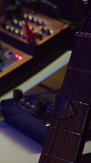 Vertical Video Electronic instruments used for mixing and recording tunes in empty home studio, soundboard controls and mastering console used to create songs. Creative space with amplifier and equalizer. Camera A. Pro Video