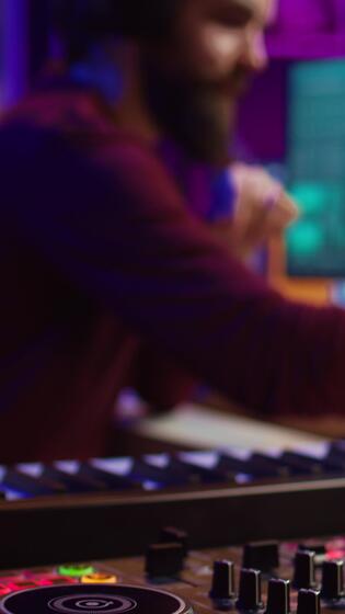 Vertical Video Music composer producing soundtracks using stereo panel controls and soundboard, twisting pre amp knobs for mixing and mastering tunes. Sound engineer adjusting volume in home studio. Camera B. Pro Video