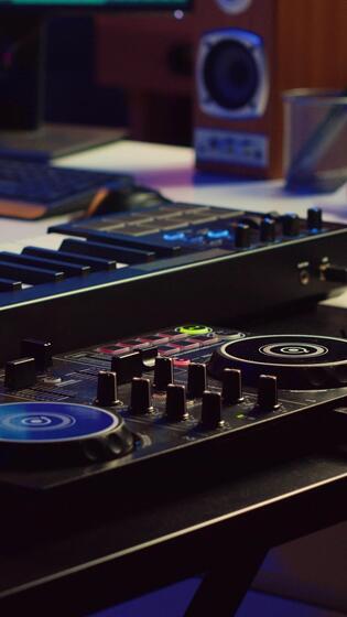 Vertical Video Empty home studio equipped with mixing console and soundboard, piano and other musical instruments to help with track recording. Mastering and mixing tunes on pc software, panel controls. Camera A. Pro Video