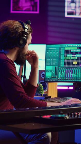 Vertical Video Sound engineer playing electronic piano keyboard and recording sounds, using mixing console and daw software to create new tunes. Music industry specialist uses stereo tools at home studio. Camera A. Pro Video