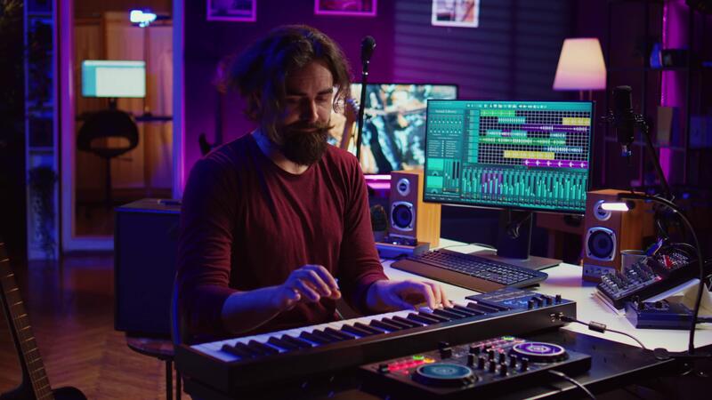 Songwriter getting upset after hearing wrong piano notes, trying to compose a song using midi controller electronic keyboard. Musician playing instrument keys to create the perfect sound. Camera B. Pro Video