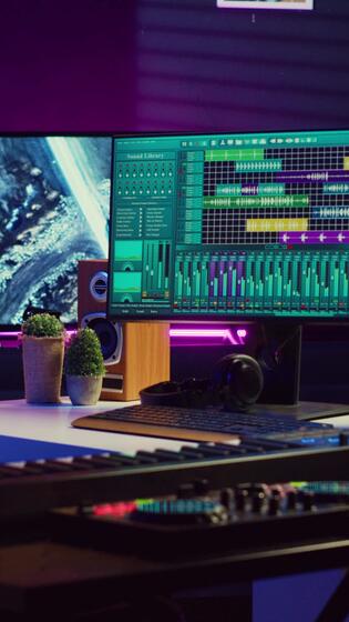 Vertical Video Empty space used for producing music and sounds with electronic devices, acoustics instruments and soundboard with controls. Home studio equipped with amplifier and mastering tools. Camera A. Pro Video
