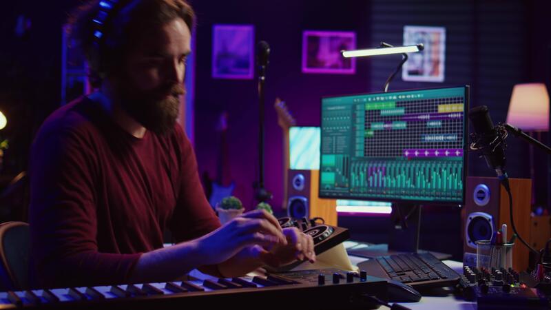 Music producer recording piano keyboard notes and editing them on a mixing console in his home studio. Skilled artist implementing advanced sound mixing techniques, equalization tools. Camera B. Pro Video