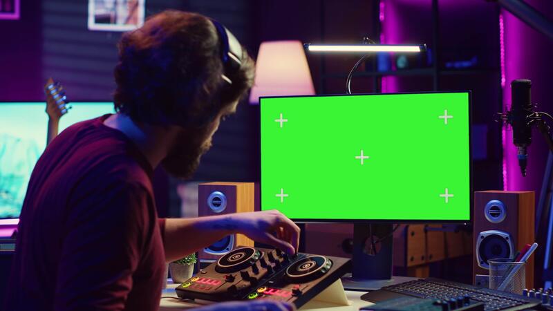 Audio engineer learning to mix piano notes with mixing console, watches online lesson tutorials on greenscreen monitor display. Music producer creating soundtracks, learns editing skills. Camera A. Pro Video