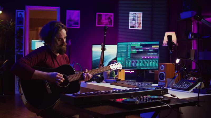 Artist playing guitar and uses DAW software interface to create music, looking at mastering controls on computer screen. Musician recording soundtracks with tools, acoustical engineering. Camera B. Pro Video