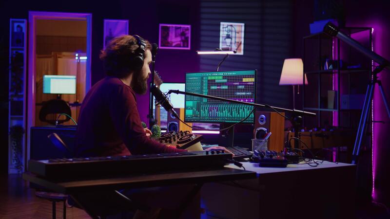 Music producer recording piano instrument and vocals to edit a new song, adjusting volume levels an adding audio effects. Sound engineer working with his mixing console and equipment. Camera B. Pro Video