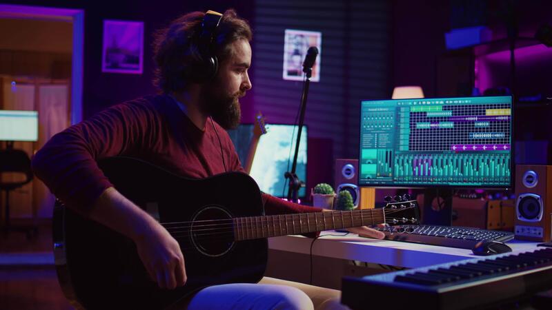 Sound engineer playing acoustic guitar and using mixing console to record music, adjusting volume and adding sound effects to tunes. Artist works with digital audio workstation software. Camera B. Pro Video