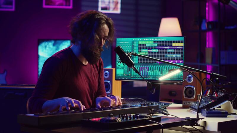 Skilled musician composing a song on piano midi controller, working with mixing console and daw software to record music. Artist singing at microphone, mastering his acoustical notes. Camera A. Pro Video