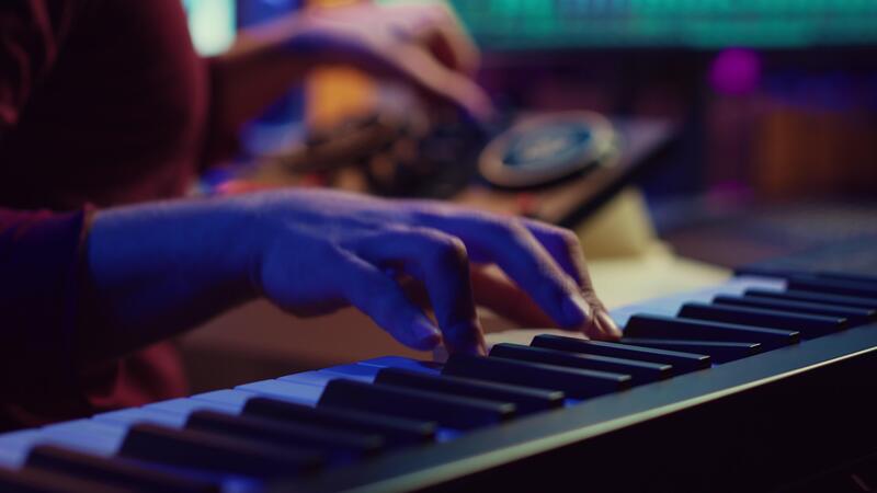 Skilled artist playing piano keyboard and recording sounds on daw software, capturing audio track instruments and vocals. Producer creating songs with mixing console in post production. Camera A. Pro Video