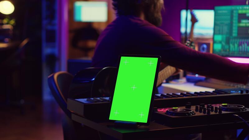 Composer performing acoustical guitar in his home studio, playing and practicing on strings. Musician learning multiple songs on instrument, uses tablet to run greenscreen display. Camera A. Pro Video