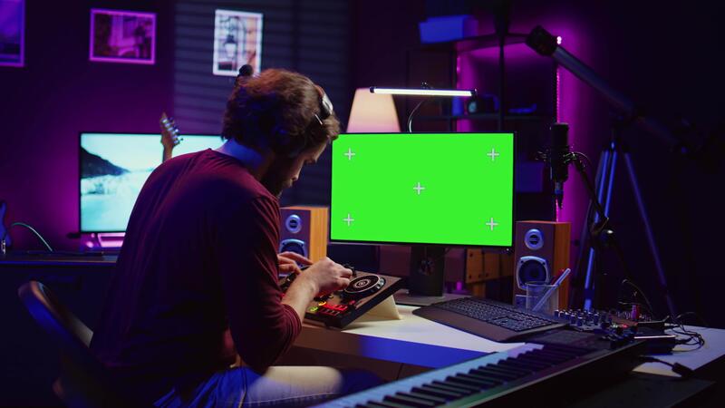 Music producer learning to use mixing console with online tutorial on computer, looking at isolated greenscreen display. Sound engineer practices editing sounds in his home studio. Camera B. Pro Video