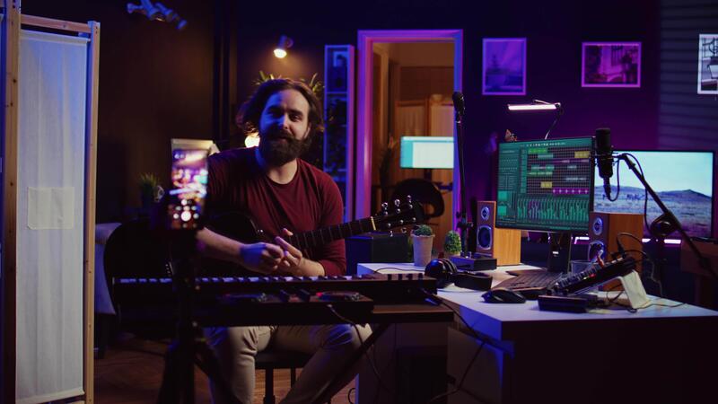 Artist teaching guitar lessons online with tutorials on social media, explaining accords on acoustic instrument with strings. Musician doing internet singing classes, filming on smartphone. Camera B. Pro Video