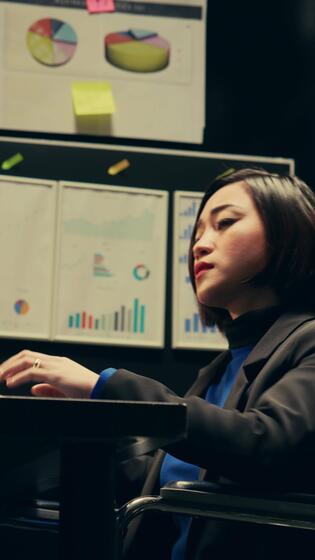 Vertical Video Private agent studying criminal files and archived folders in incident room, working on legal investigation to build suspects profile. Wheelchair user reading statements and reports. Camera B. Pro Video