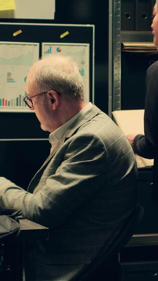 Vertical Video Inspectors team reviewing case information and reading witness statements to create a profile for the suspect. Detectives look into forensic evidence in police archive room, criminology. Camera A. Pro Video