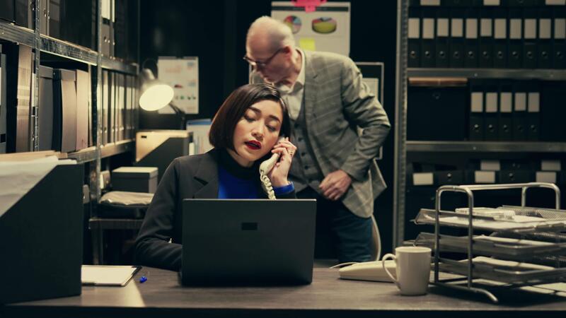Agent communicates with detectives or law enforcement personnel to discuss findings and share updates to help with ongoing investigation. Officer asks for forensics on landline phone call. Camera B. Pro Video
