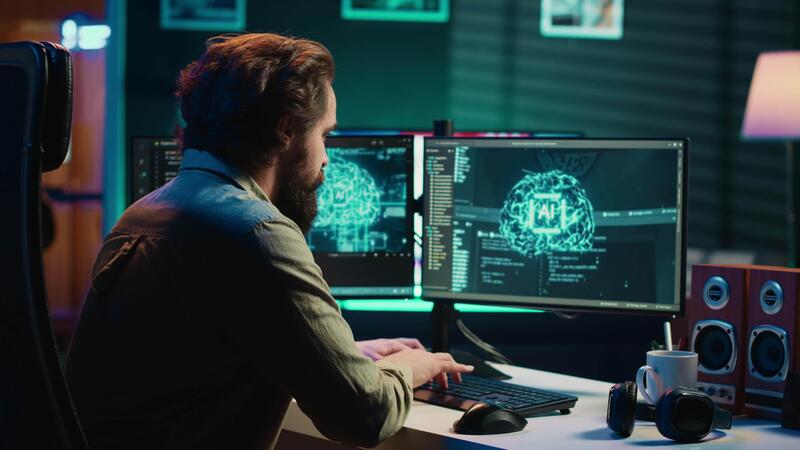 Happy programmer celebrating after managing to make AI become sentient and ask questions about itself. Ecstatic developer punching desk in excitement after achieving AI singularity, camera A Pro Video