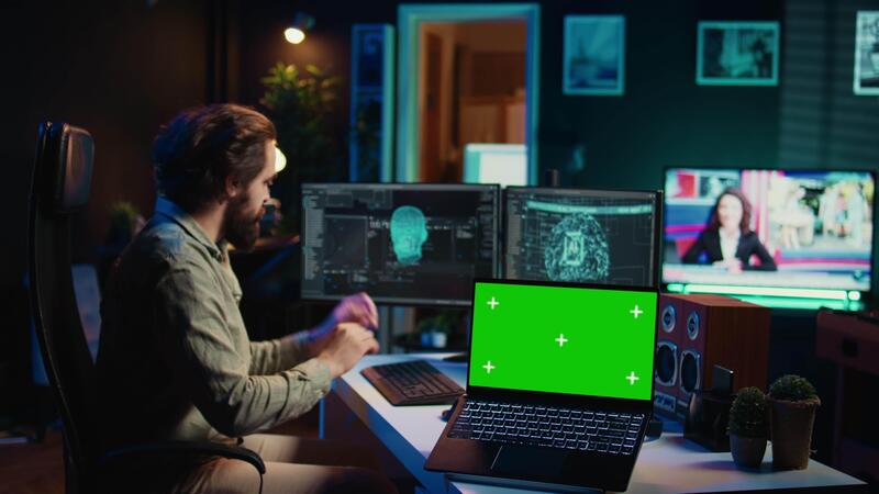 Programmer being asked existential questions by awaken AI gaining consciousness next to chroma key laptop. Man communicating with artificial intelligence through isolated screen device, camera B Pro Video