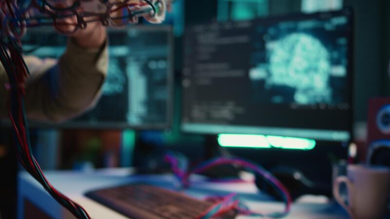 Computer scientist uploading brain into cyberspace, gaining digital persona, close up shot. Neuroscientist merging mind and soul with AI, uploading consciousness, camera B Pro Video