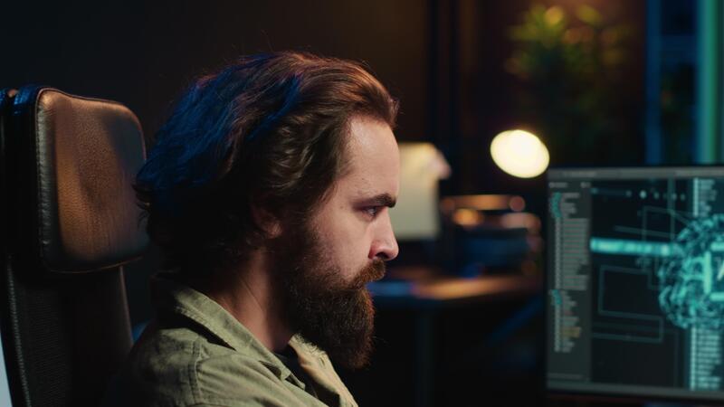 Computer scientist updating artificial intelligence machine learning algorithm, writing binary code scripts. IT specialist in apartment office uses programming to upgrade AI, camera A close up Pro Video