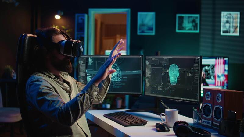 Programmer using VR headset to answer awaken AI gaining consciousness asking existential questions. Developer using virtual reality tech to chat with artificial intelligence, camera B Pro Video