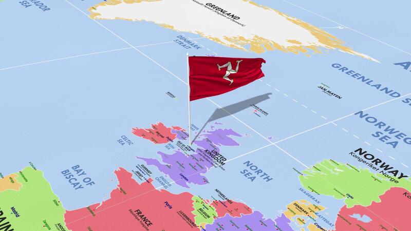 Isle of Man Flag Waving in Wind, World Map Rotating around Flag, Seamless Loop, 3D Rendering Free Video