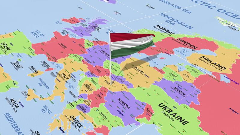 Hungary Flag Waving in Wind, World Map Rotating around Flag, Seamless Loop, 3D Rendering Free Video