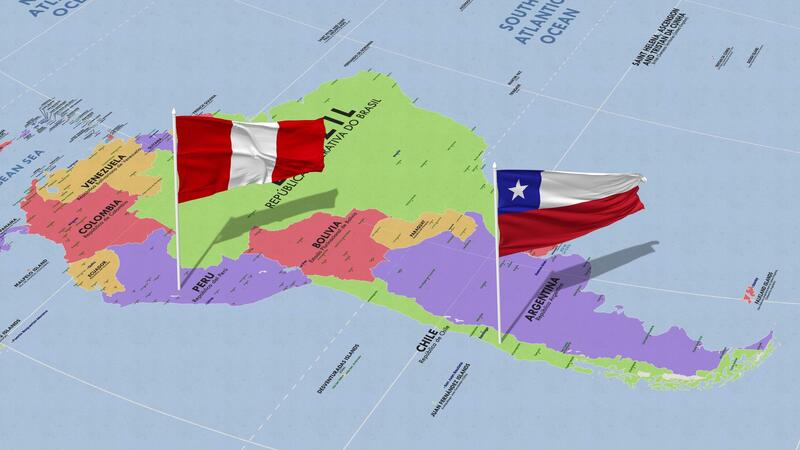 Peru and Chile Flag Waving with The World Map, Seamless Loop in Wind, 3D Rendering Free Video
