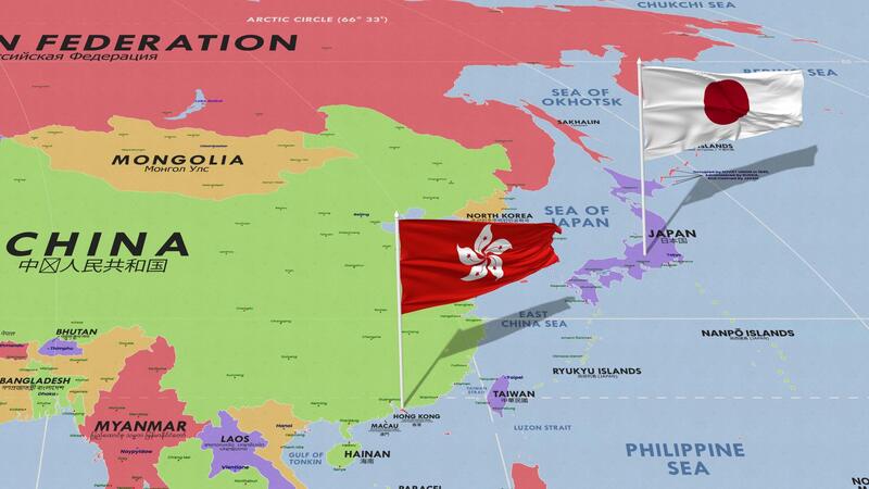 Hong Kong and Japan Flag Waving with The World Map, Seamless Loop in Wind, 3D Rendering Free Video