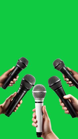 AI generated hands holding mic with interview set vertical video template on green screen background Free Video