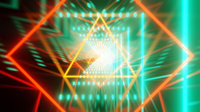 Advanced triangular Square shaped Neon red green Technology Portal. 3d rendering, vj loop. Pro Video