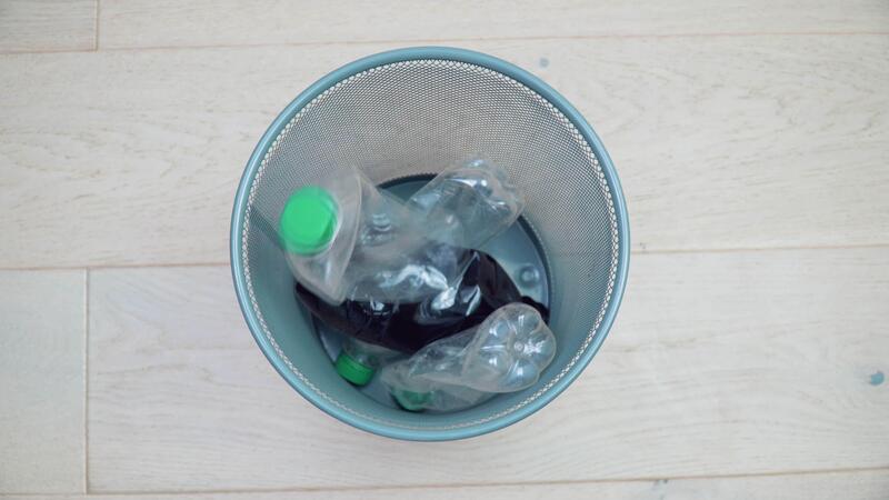 An empty trash can contains five bent plastic bottles and one green glass bottle of beer. Mixed garbage. Sorting and processing of plastic and glass waste. Garbage sorting. Recycling Pro Video