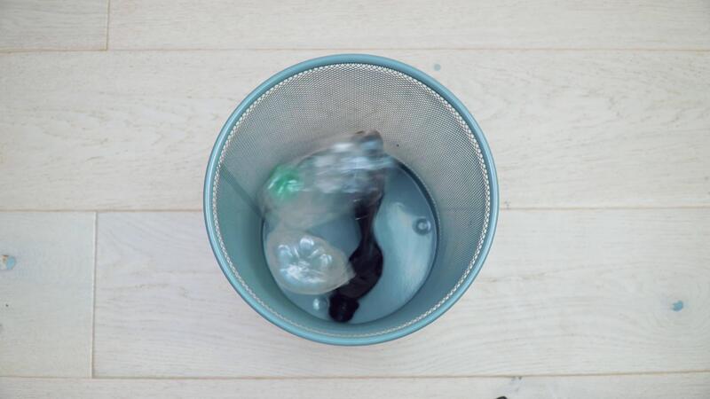 Five bent plastic bottles fall into an empty trash can. Sorting and processing of plastic waste Pro Video