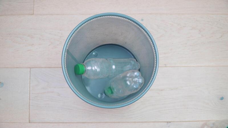 An empty trash can contains five plastic bottles and one green glass bottle of beer. Mixed garbage. Garbage sorting. Recycling Pro Video