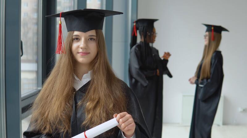 Students of different nationalities in the university lobby. Master of Social Science. One university graduate in a master's robe with a diploma of higher education is standing in front of the camera Pro Video