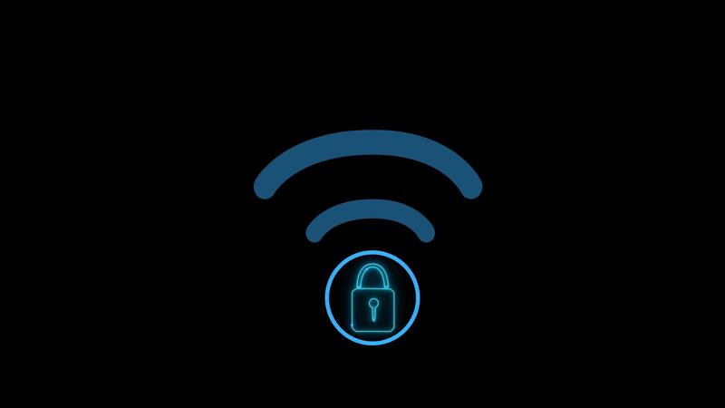 secure Wi-Fi connection. It shows a bright blue Wi-Fi symbol with a padlock icon at the center of the lower arc, indicating that the network is password protected or encrypted. Free Video