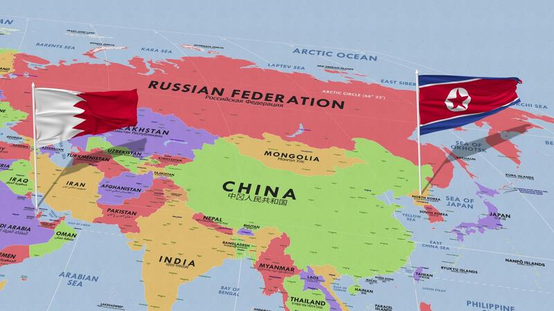 Bahrain and North Korea Flag Waving with The World Map, Seamless Loop in Wind, 3D Rendering Free Video