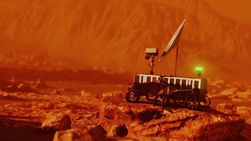 Mars robotic rover on red place surface searching for signal. Landscape mission science and space cosmos galaxy exploration in univers and space, robot vehicle in cosmos. 3D render animation Pro Video