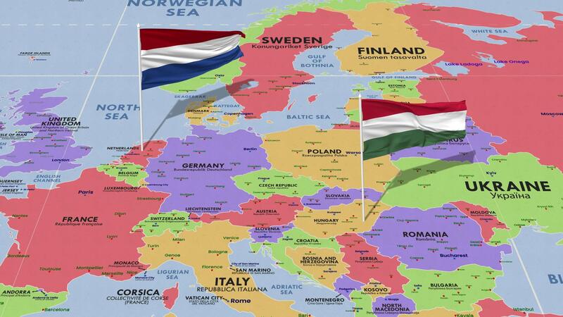 Hungary and Netherlands Flag Waving with The World Map, Seamless Loop in Wind, 3D Rendering Free Video