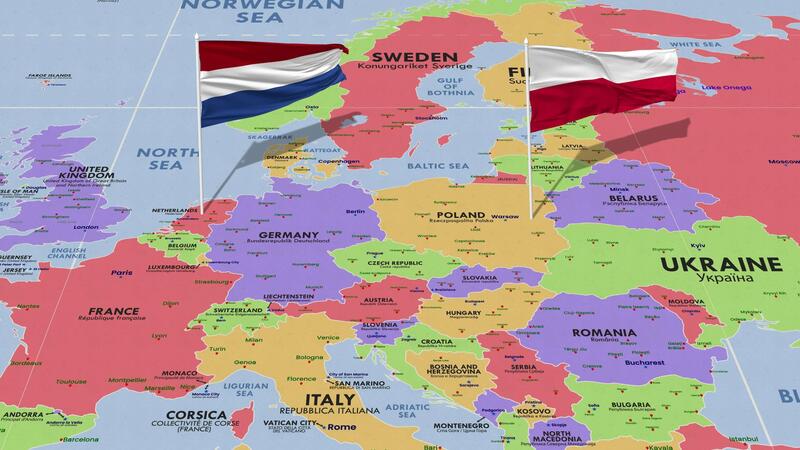 Poland and Netherlands Flag Waving with The World Map, Seamless Loop in Wind, 3D Rendering Free Video
