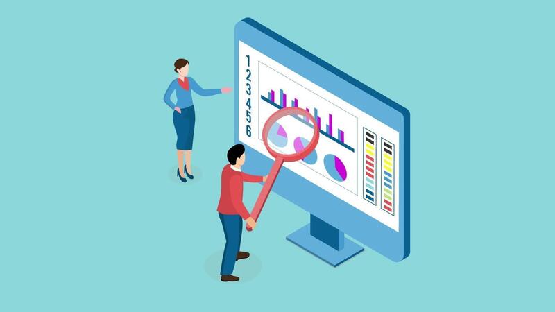 A business team using data visualization and financial investment monitoring to analyze business data. 2D isometric Animation Free Video