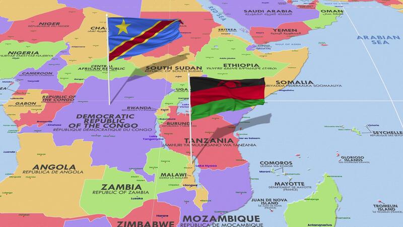 Malawi and DR Congo Flag Waving with The World Map, Seamless Loop in Wind, 3D Rendering Free Video