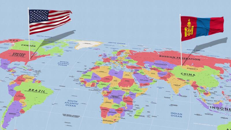 Mongolia and United States Flag Waving with The World Map, Seamless Loop in Wind, 3D Rendering Free Video