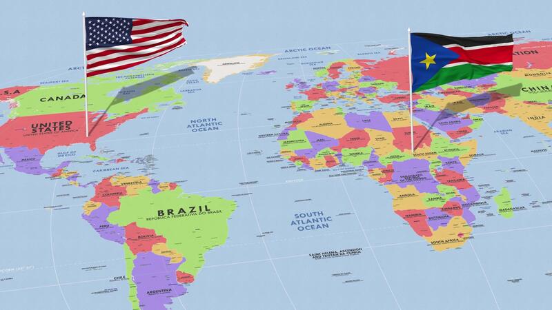 South Sudan and United States Flag Waving with The World Map, Seamless Loop in Wind, 3D Rendering Free Video