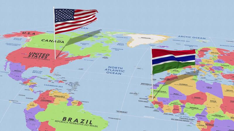 Gambia and United States Flag Waving with The World Map, Seamless Loop in Wind, 3D Rendering Free Video