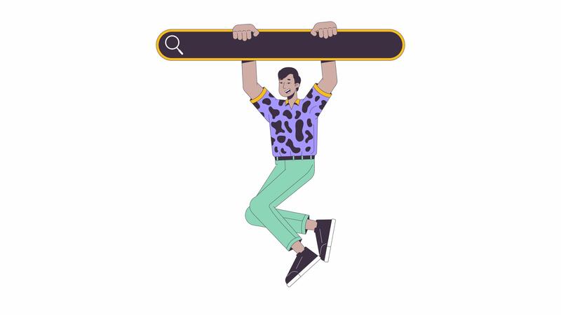 Web search engine using line 2D animation. Happy indian man hanging on website bar 4K video motion graphic. Using browser to find information linear animated cartoon flat concept, white background Pro Video