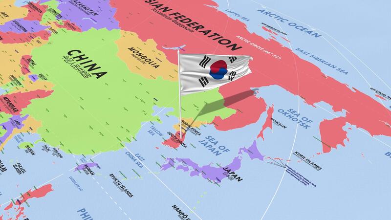 South Korea Flag Waving in Wind, World Map Rotating around Flag, Seamless Loop, 3D Rendering Free Video