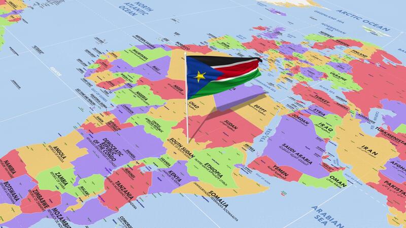 South Sudan Flag Waving in Wind, World Map Rotating around Flag, Seamless Loop, 3D Rendering Free Video